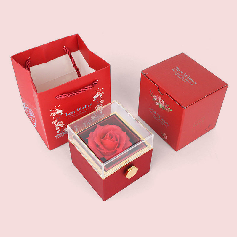 Dubbel betydelse i en låda: En sida bär en romantisk gåva (ring eller halsband), medan den andra visar en "aldrig dörande" ros – en symbol för en kärlek som aldrig slår ut. Lådan är fylld med romantisk och öm känsla, perfekt för att vinna hjärtat.