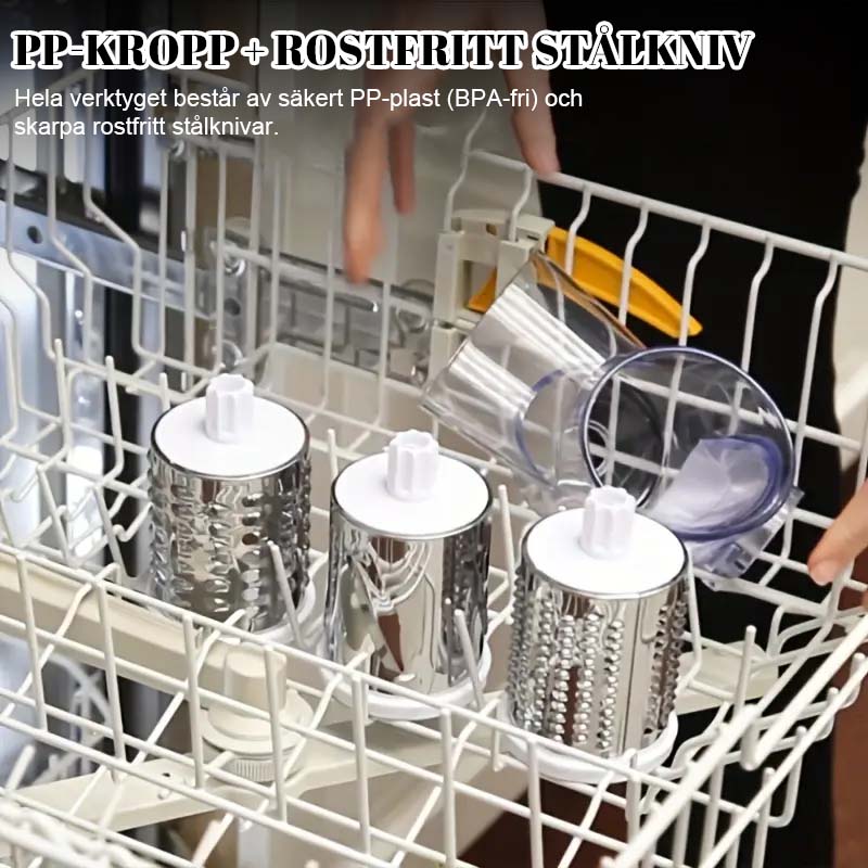 Skiva-, skarpa- och skivfunktion: Verktyget kommer med skiftbara cylinderknivar som låter dig skära potatisar till tunnare skivor (för chips eller ugnsstekt potatis), skava morötter eller zucchini, och skapa finmaskad skiva för sallader eller soppor.